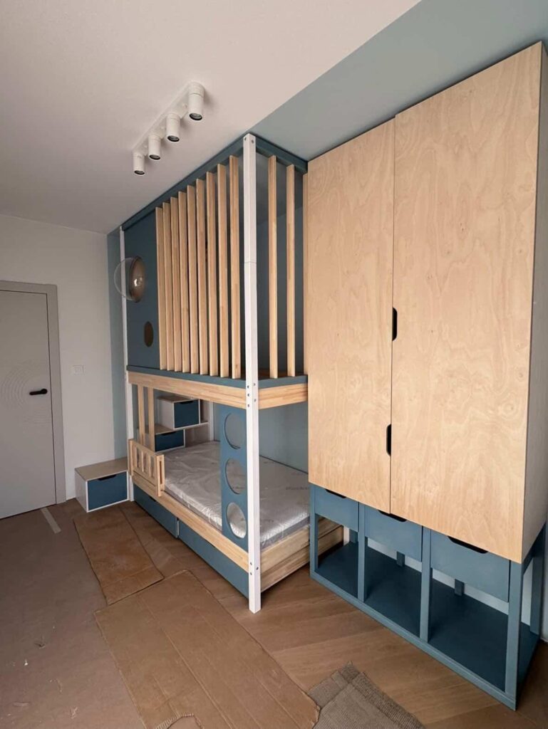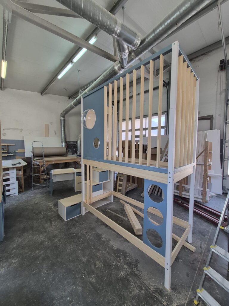 Wszystkie meble wykonaliśmy z drewna sosnowego, klejonego, bezsęcznego oraz sklejki liściastej wysokiej jakości. Farba z palety NCS oraz lakier bezbarwny o wykończeniu satynowym to produkty typu wodnego, bezwonne, bezpieczne dla dzieci. Dzięki temu, że meble zostały pomalowane, nie ma tutaj zagrożenia, że jakaś okleina na rantach zacznie po jakimś czasie odchodzić, że coś się odparzy. Tutaj nie ma po prostu okleiny 🙂