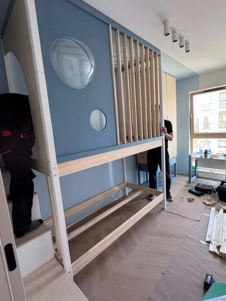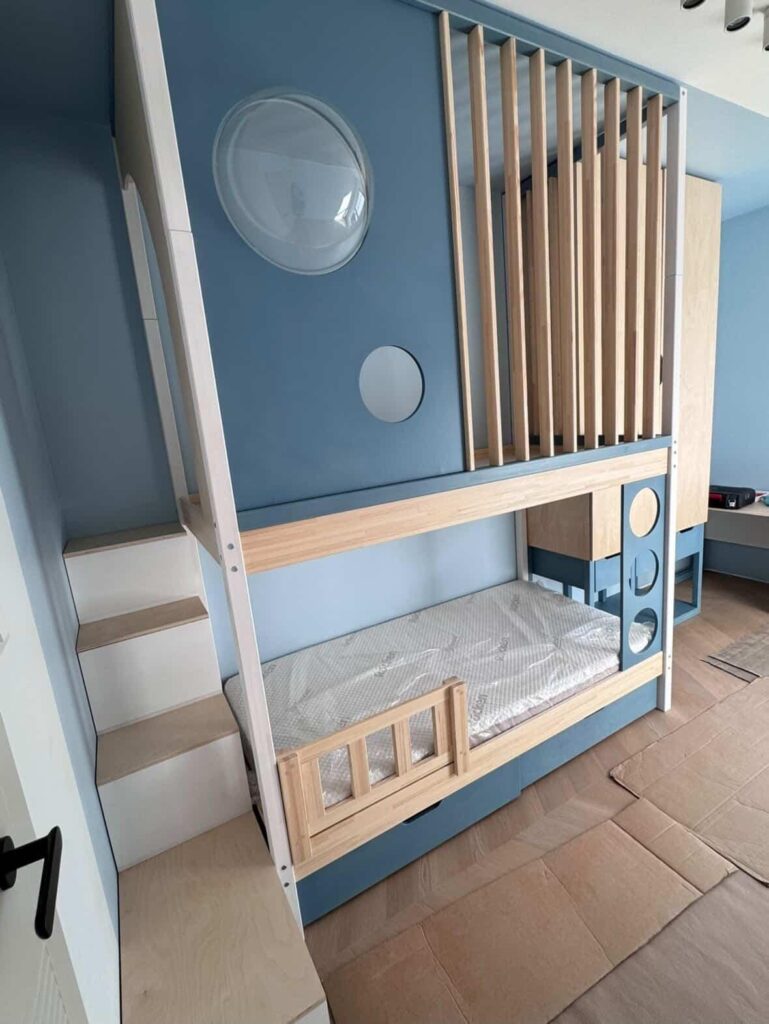 Zupełnie od nowa zaprojektowaliśmy łóżko z kosmiczną bazą do zabawy. Piętrowa zabudowa pozwala nam na wykorzystanie dodatkowego miejsca w pionie, które można przeznaczyć na przykład na miejsce do zabawy.