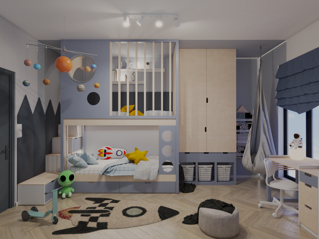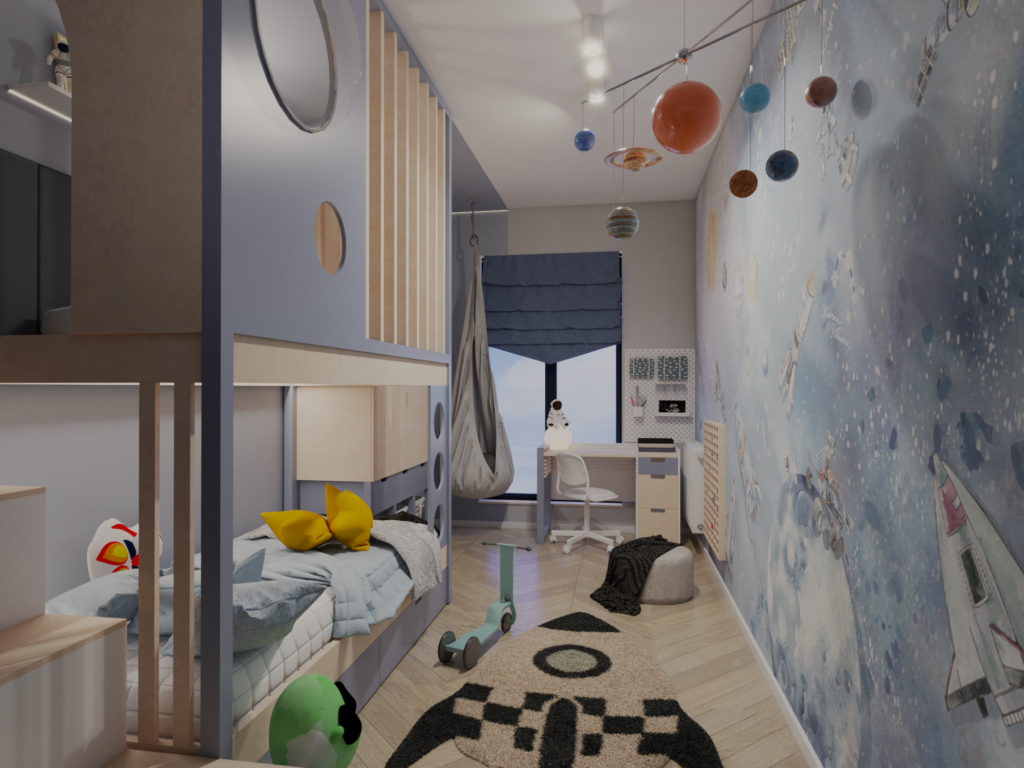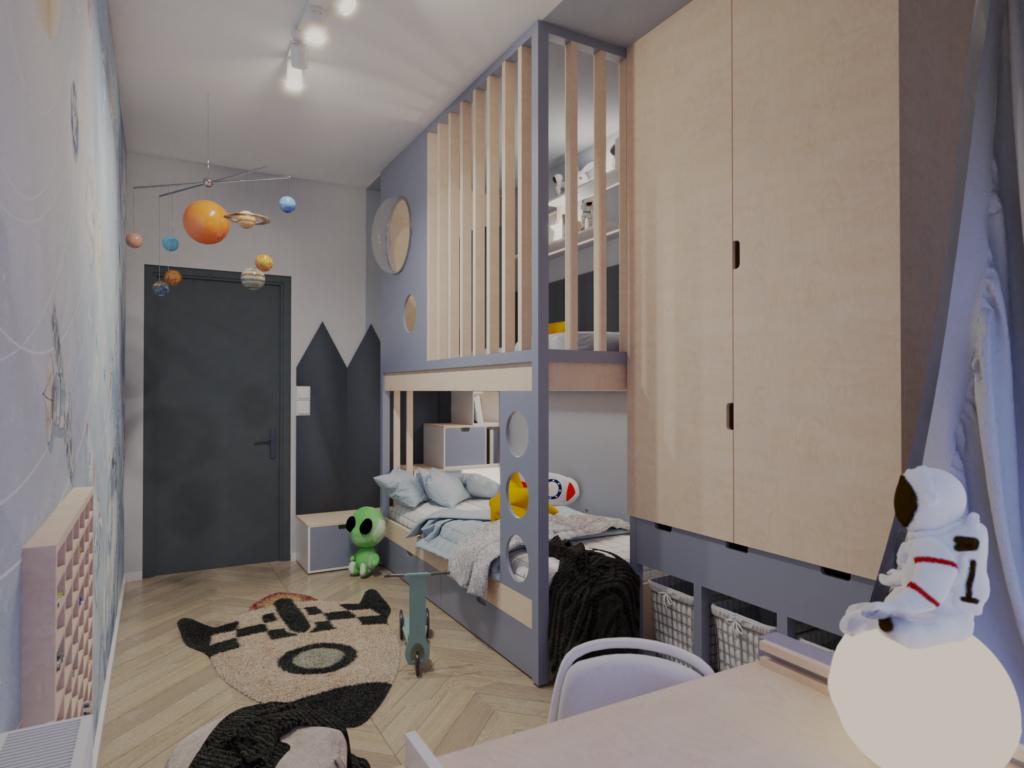 Wizualizacja 3D kosmicznego pokoju dla chłopca