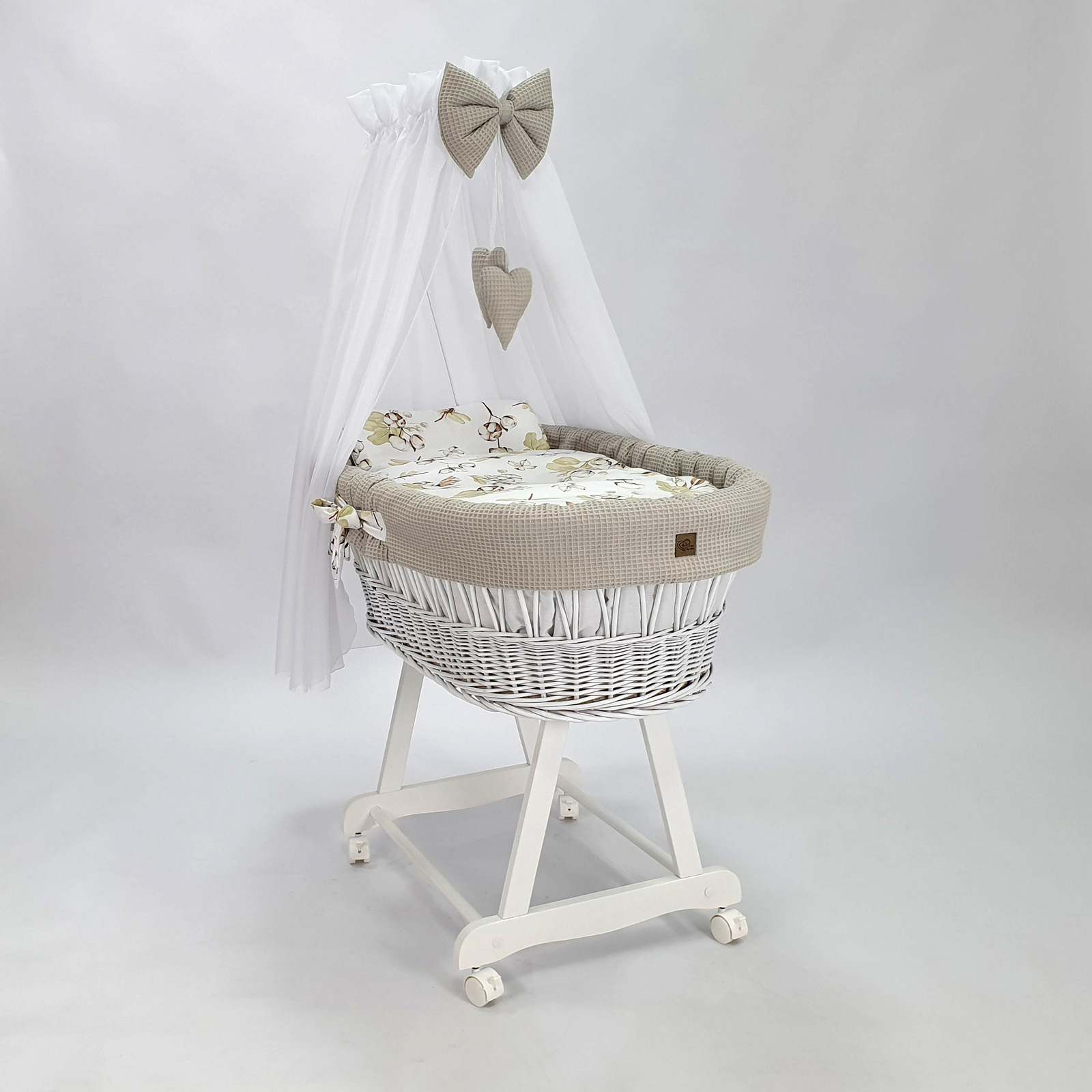 W komplecie z koszem otrzymasz również tekstylia. Bardzo starannie odszyte obszycie, pościel, materacyk i baldachim.