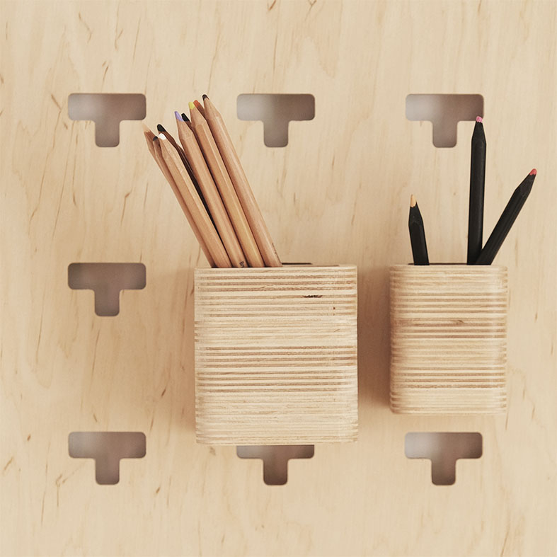 Element systemu SZARAGI | pegboard. Pomieści długopisy, kredki, pisaki, pędzle oraz inne akcesoria plastyczne, biurowe i kosmetyczne, a także drobne narzędzia i klocki.