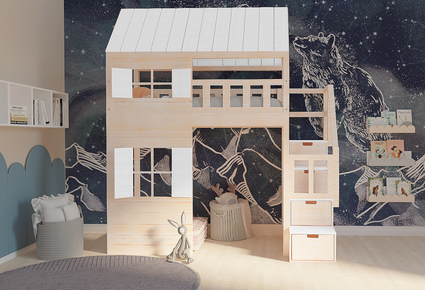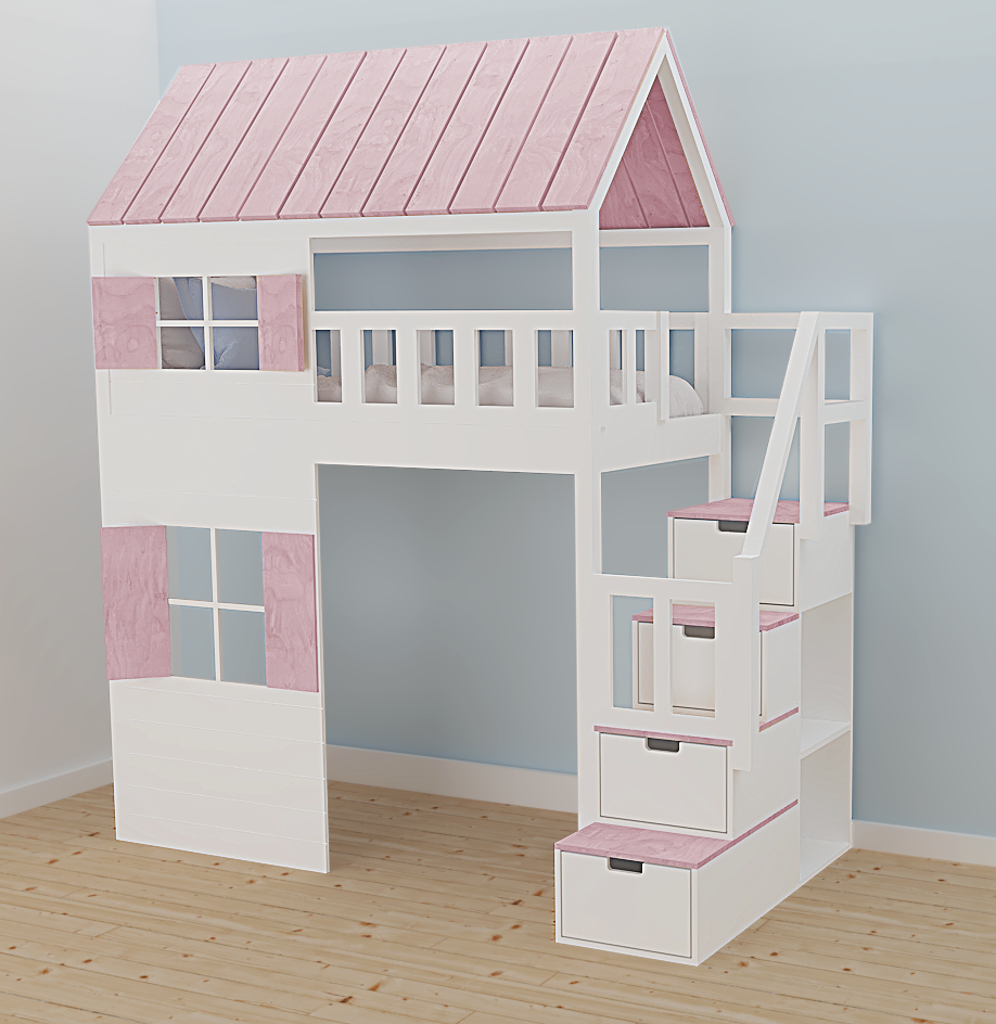 Schody – wykonane z wytrzymałej i pięknej sklejki liściastej (mogą po nich wchodzić osoby dorosłe) to nie tylko element wiodący na górę, to doskonałe rozwiązanie do przechowywania. Cztery szufladki na prowadnicach pomieszczą dziecięce skarby. A półki, do których dostęp zapewniony jest z obu stron, to miejsce do przechowywania większych zabawek czy książek. Pełne schody z poręczą, zamiast drabinki zapewniają komfortowe i stabilne wejście, nawet dla młodszych dzieci.