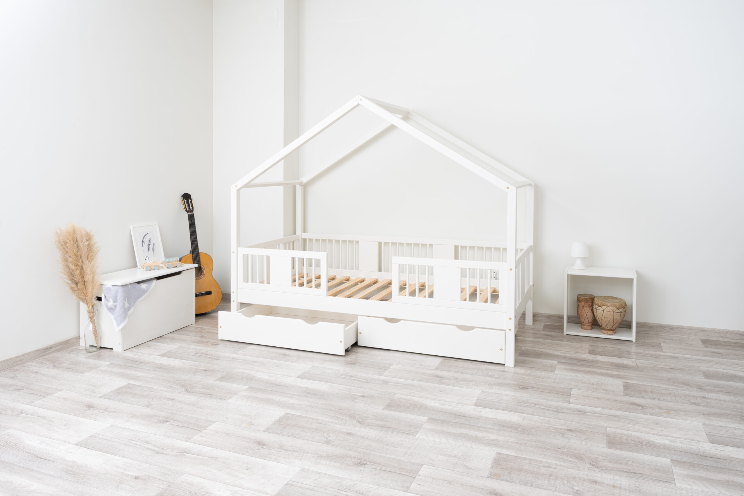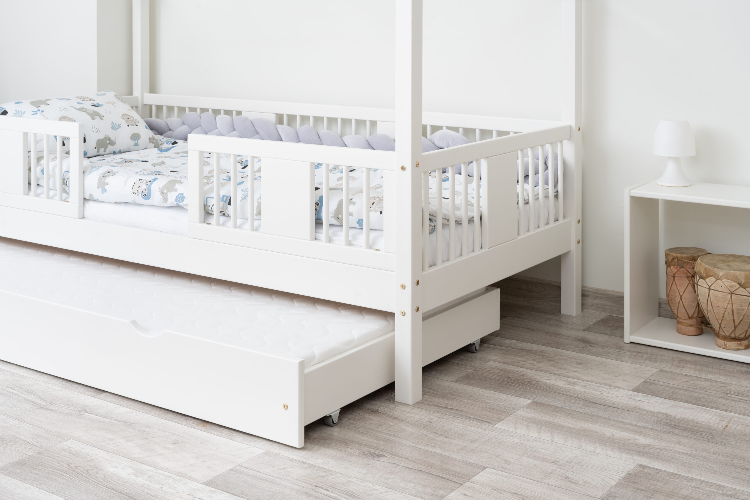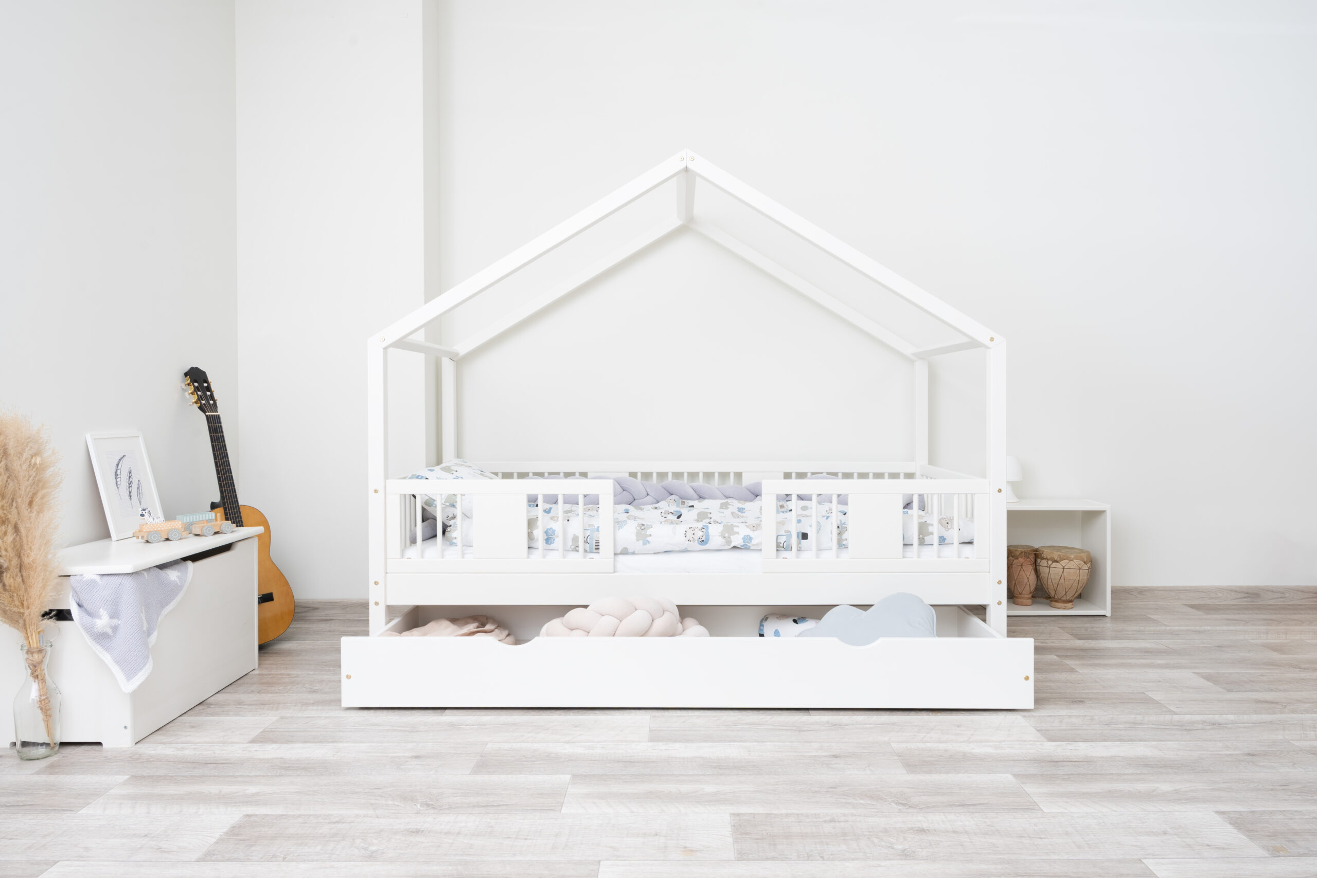Model 155G to łóżko dziecięce w kształcie domku zaprojektowane z myślą o maluchach, które stawiają pierwsze kroki w samodzielnym spaniu. Nóżki na wysokości 20 cm pozwalają nie tylko na wyższe miejsce do siedzenia, ale również możliwość zamontowania pod łóżkiem wygodnych szuflad do przechowywania lub szuflady na drugi stelaż pod materac. Wszystkie szuflady wysyłamy na wygodnych gumowych kółeczkach. Dzięki temu wszystkie szuflady można swobodnie wysunąć spod łóżka i np. posprzątać pod spodem.