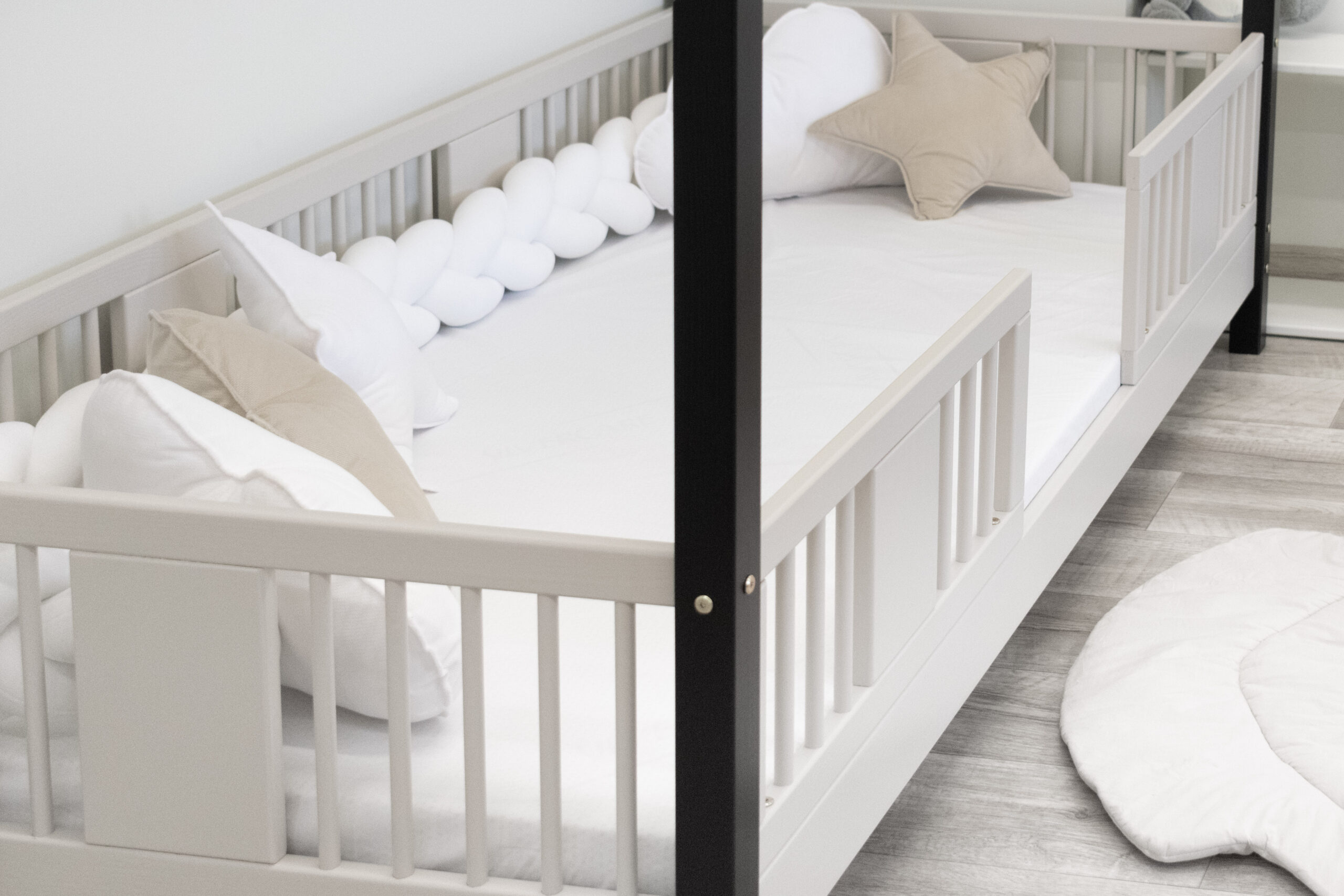 Zaokrąglone szczebelki nadają całości subtelny, przyjazny charakter. Ich gładka forma podkreśla delikatność konstrukcji, a jednocześnie zapewnia pełne bezpieczeństwo podczas codziennego użytkowania przez najmłodszych.