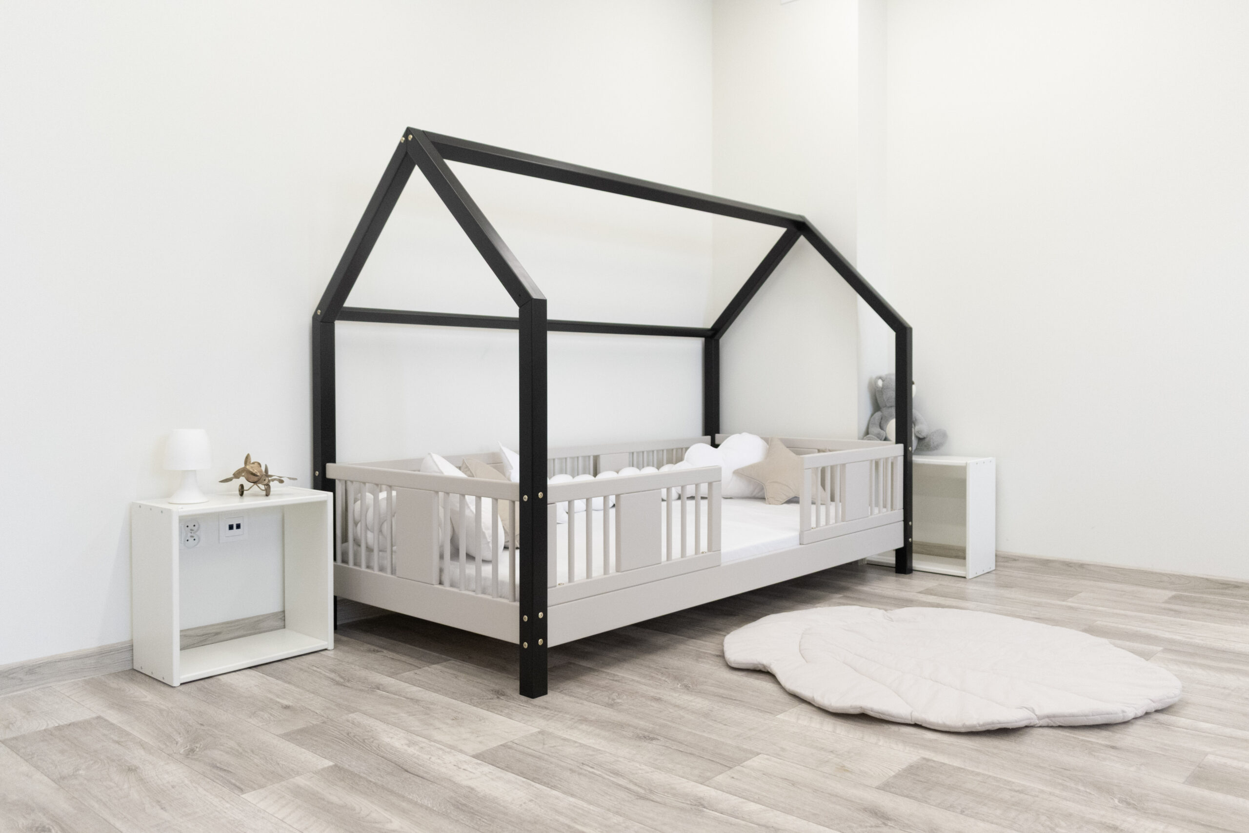 Łóżko pomalowane jest farbą wodną, bezpieczną dla dzieci w kolorach czarnym i kaszmirowym.