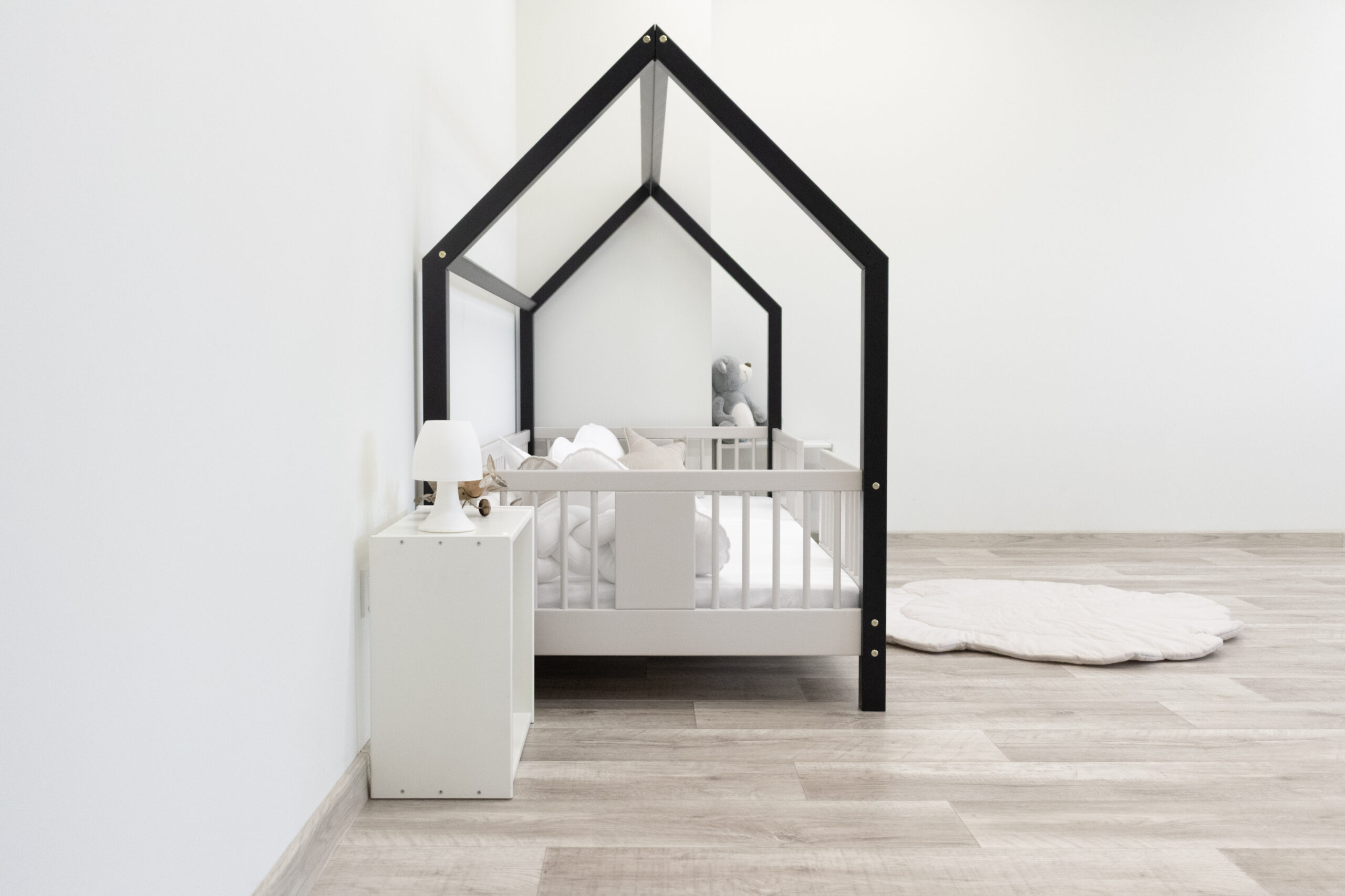 To pojedyncze łóżko w kształcie domku, które naturalnie łączy funkcję snu, zabawy i wspólnego spędzania czasu z rodzicami. Prosta forma, miękkie linie i naturalne drewno tworzą spokojne, harmonijne otoczenie sprzyjające wyciszeniu i relaksowi.