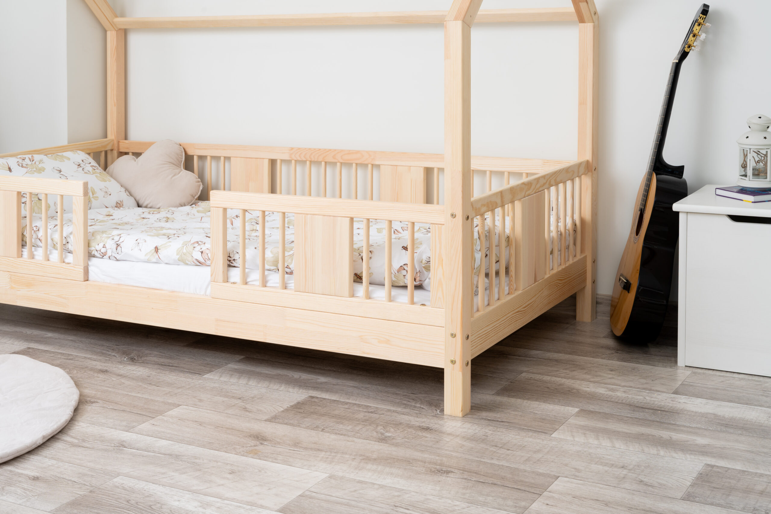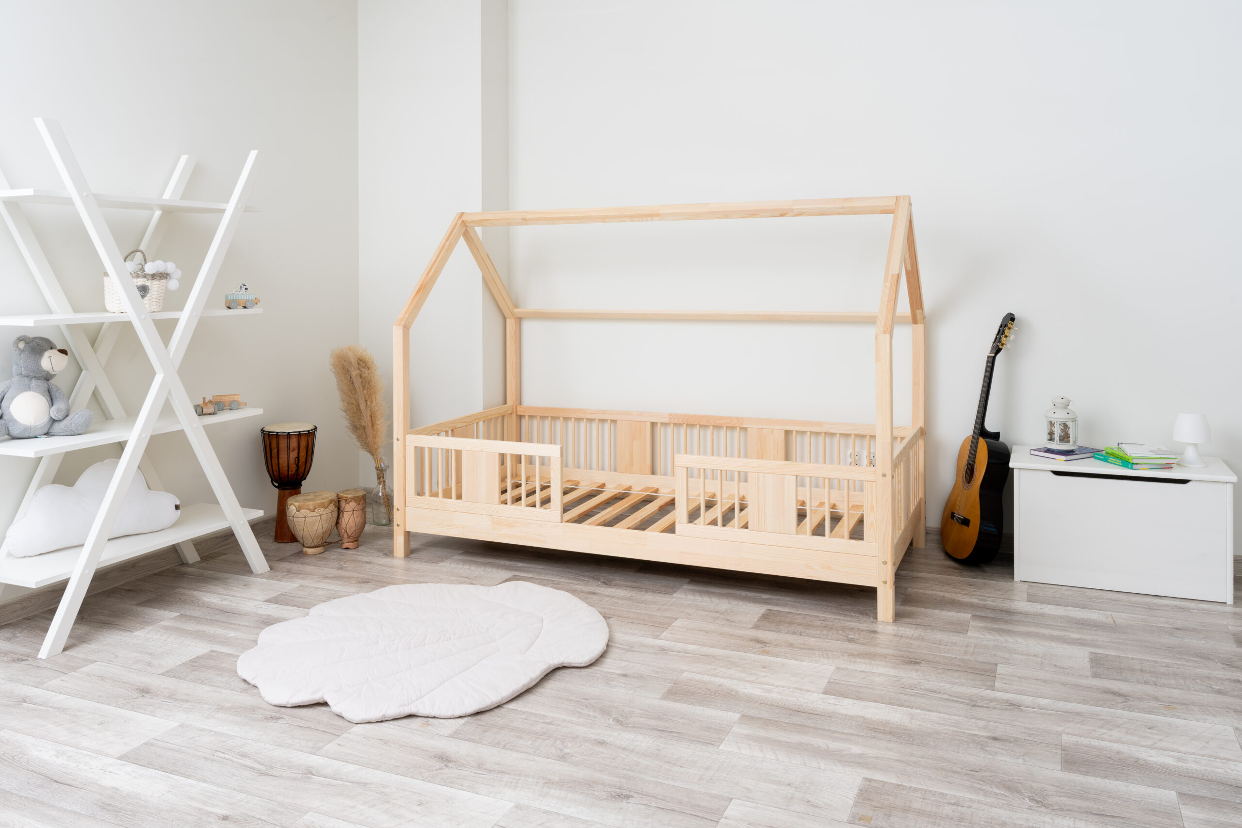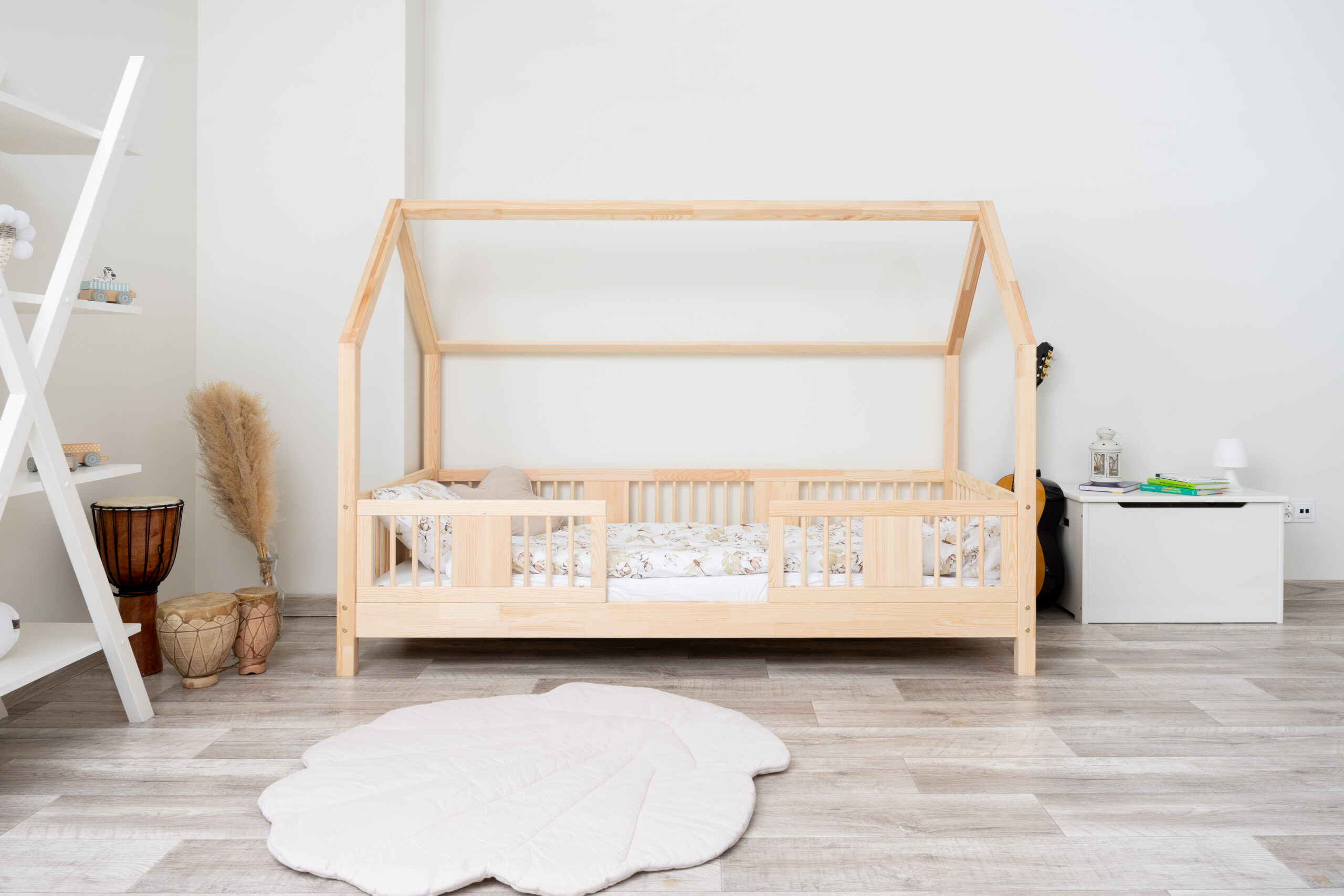 Konstrukcja łóżka domku wykonana została z klejonego drewna sosnowego, znanego ze swojej trwałości i estetycznego wyglądu. Jasny odcień drewna wnosi do pokoju dziecięcego ciepło i lekkość, idealnie wpisując się w naturalne aranżacje.