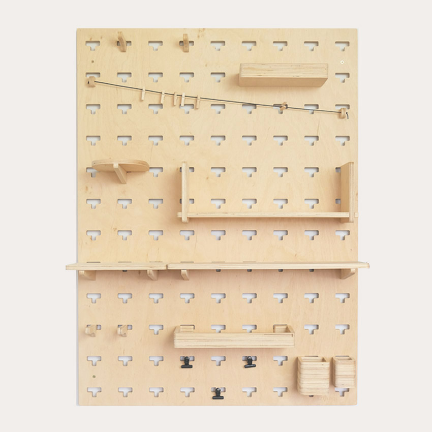 Dobrze zaprojektowane meble zawsze dostosowują się do twoich potrzeb. Wszystkie elementy, w które wyposażyliśmy nasz pegboard są ruchome i pozwalają na tworzenie setek kreatywnych konfiguracji. Jeśli nie wystarcza ci skomponowany przez nas podstawowy zestaw akcesoriów, w każdej chwili możesz poszerzyć go o dodatkowe elementy, które znajdziesz w ofercie naszego sklepu. Jeden pegboard to za mało, by pomieścić wszystkie przedmioty, które chcesz mieć pod ręką? Dzięki specjalnemu systemowi łączników z kilku naszych tablic zamocowanych obok siebie w pionie lub poziomie stworzysz obszerny, zintegrowany organizer.