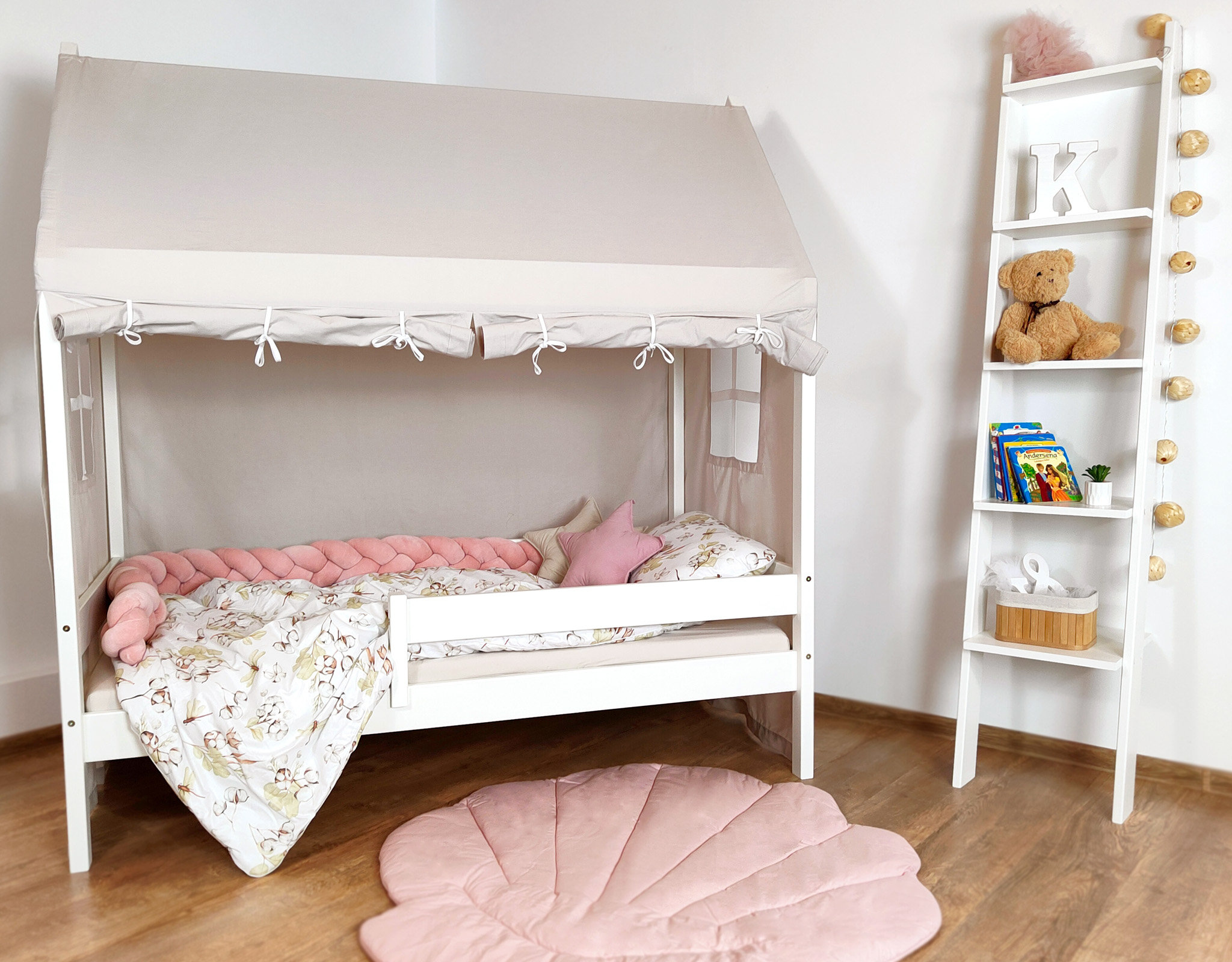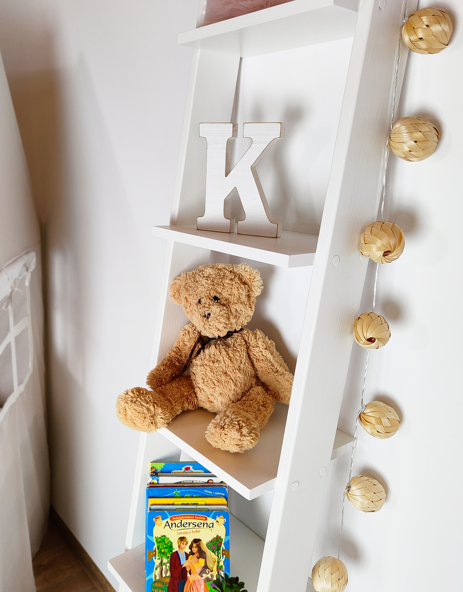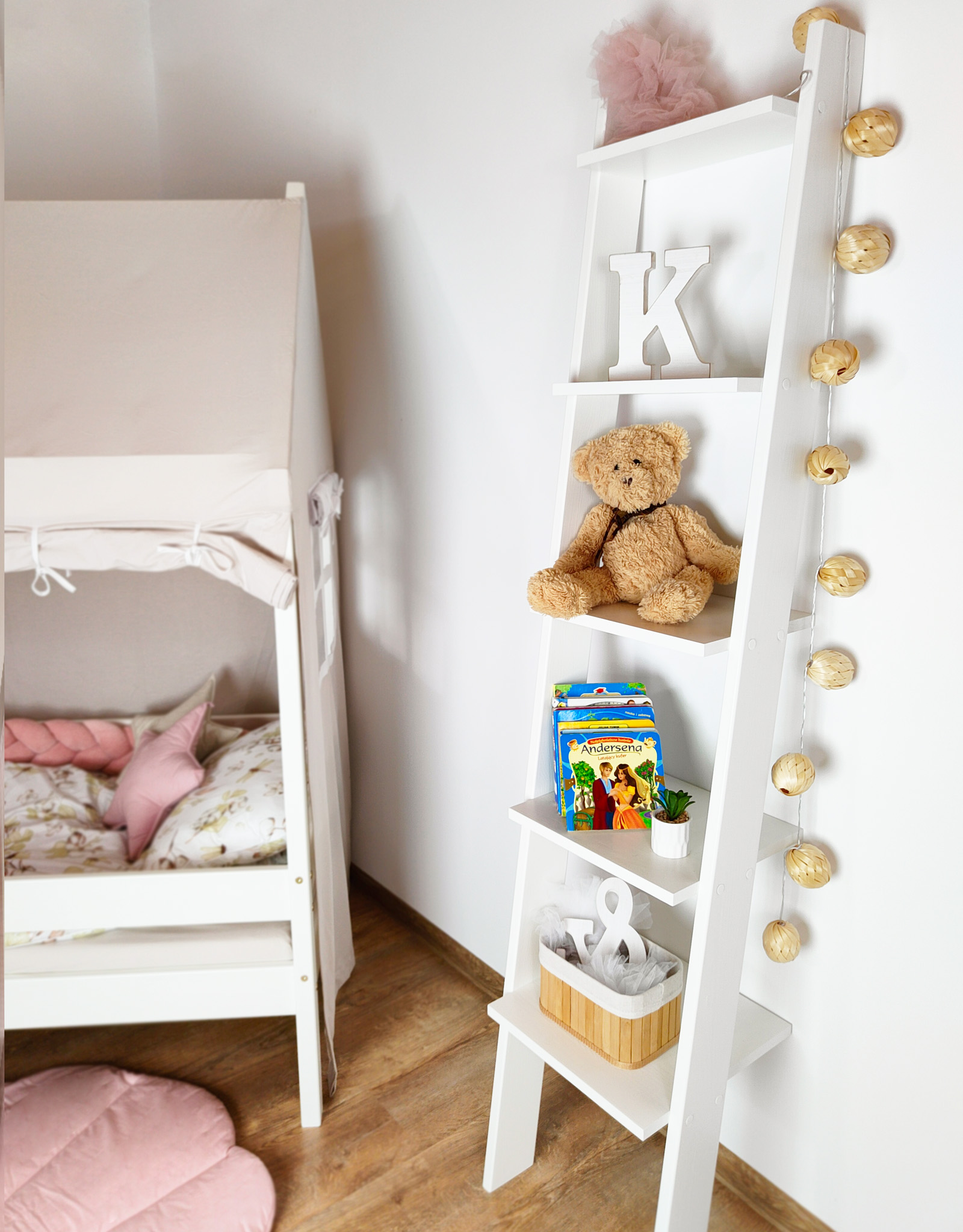 Bardzo prosty w swoim designie regał na książki i zabawki do dziecięcego pokoju – w kształcie drabinki – jest jednocześnie doskonałym elementem dekoracyjnym i użytkowym.