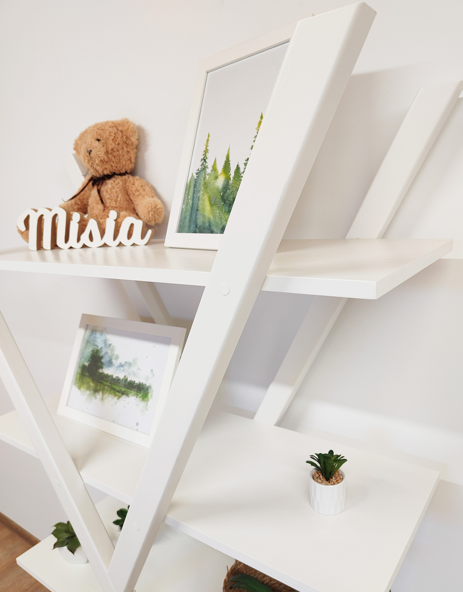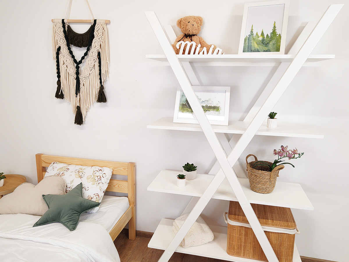 Regał do dziecięcego pokoju, który ozdobiony jest literą X. Pomieści książki i inne dziecięce przydasie.