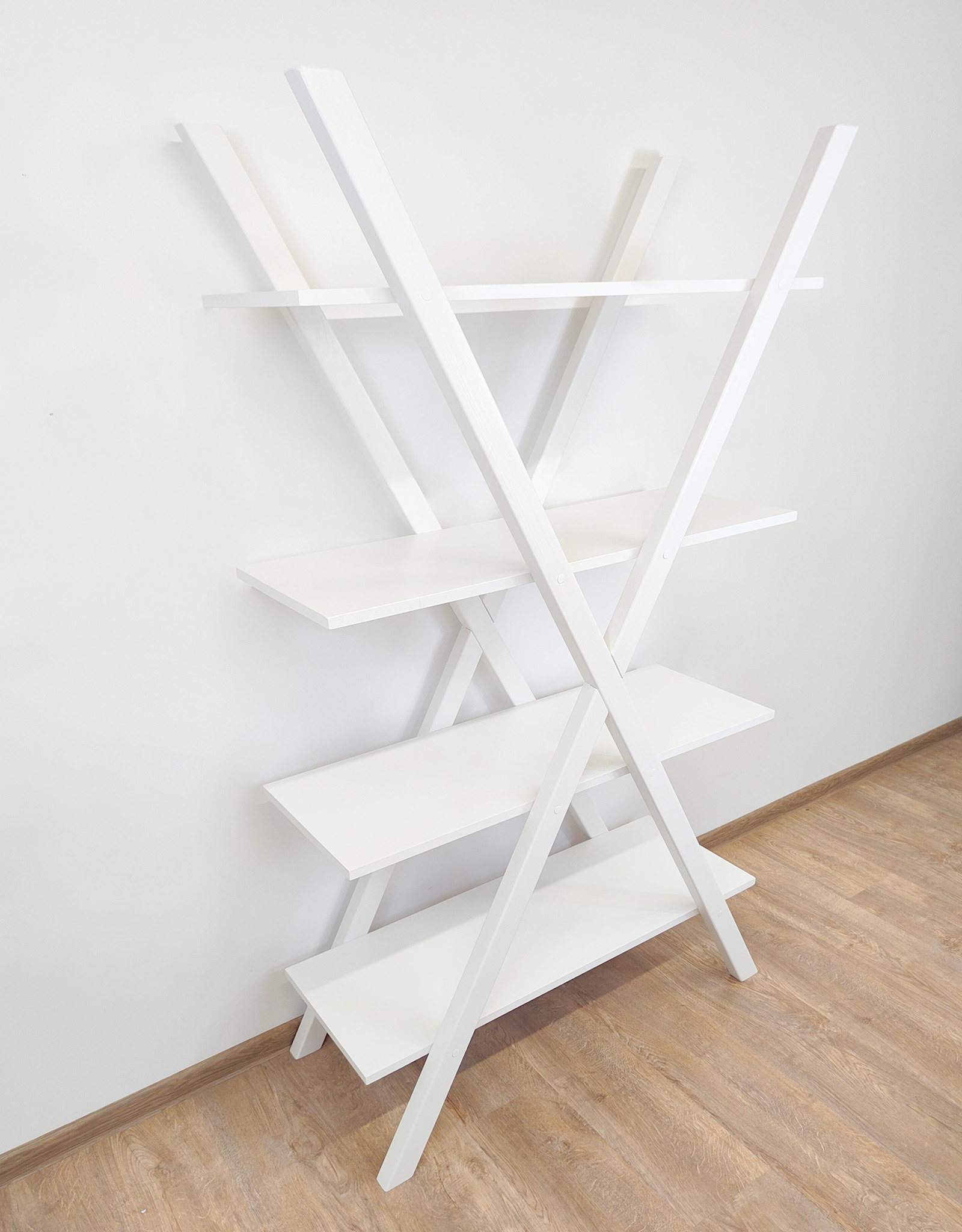 Regał wykonany jest z drewna sosnowego malowany na kolor biały.